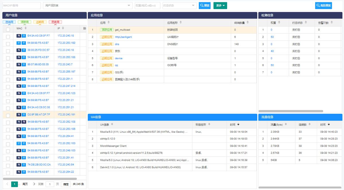 3.此图展示的为每个IP的- 应用信息、UA信息、共享检测信息、流量信息 -(从而分析哪个用户为私接用户)