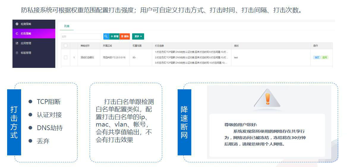 防私接系统可根据权重范围配置打击强度;用户可自定义打击方式、打击时间、打击间隔、打击次数。