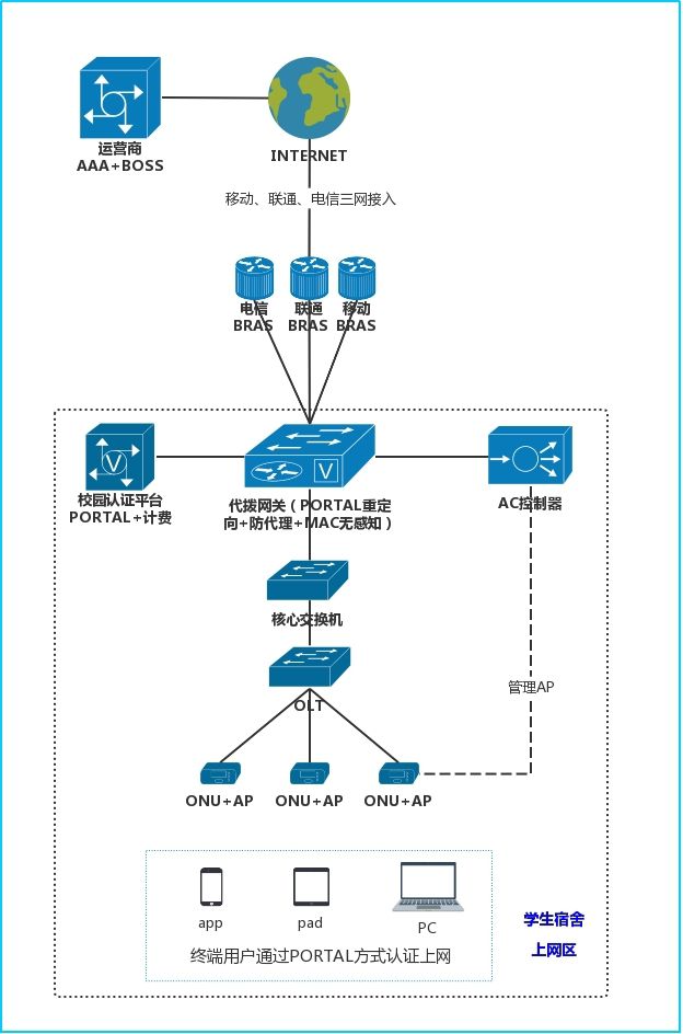 适用于已有校园网,或是全部校园内网由运营商或校园自建,但是三大运营商都需要接入,校园允许三大运营商接入,在学校自已的代拨网关上,分别对三家运营商进行代拨选路。