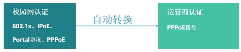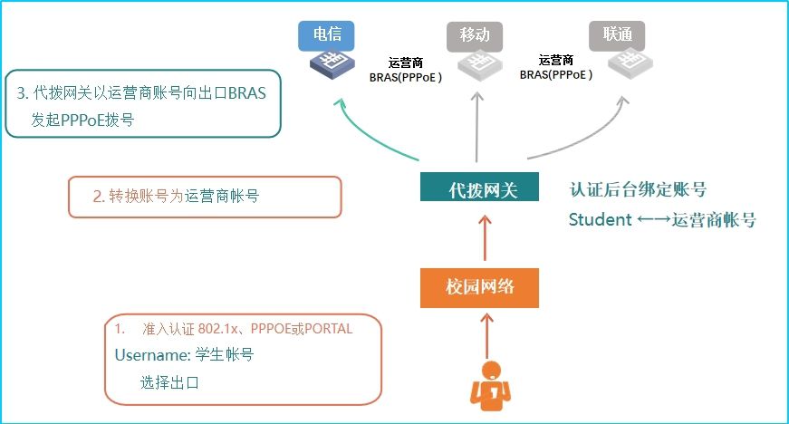 PPPoE一对一代拨,是由校园运营商建设校园网,由三大运营商提供带宽和帐号接入到校园出口,校园运营商为学生提供上网帐号,学生在客户端使用802.1x、IPoE、Portal、PPPoE等方式与代拨网关建立认证连接,再通过代拨网关自动转换为运营商帐号密码,实现一对一代拨上网。