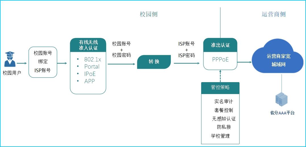 Ø 学校只需部署一套代拨网关+AAA认证。