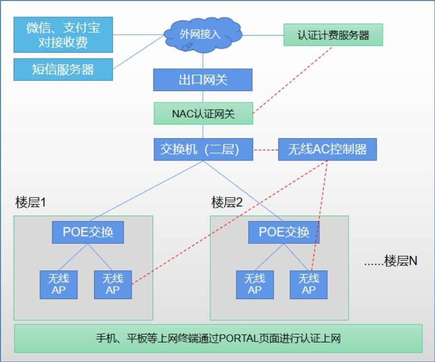 Ø 所有的上网人员,通过PORTAL页面,进行自动注册,并通过支付宝和微信交费上网。