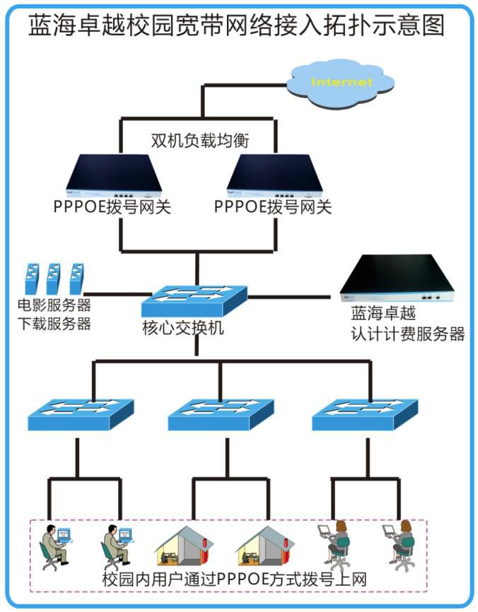 · 外网光纤接入两台蓝海卓越BRAS-5000-20网关设备设备,两台网关之间进行负载均衡,双机热备