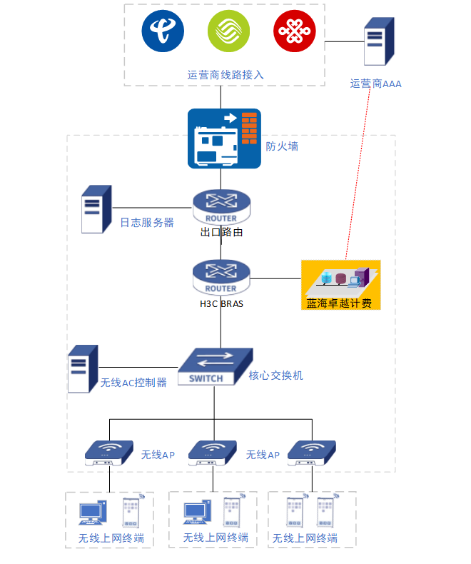 经过多方调研与方案比对,宝鸡机电学院最终选择与蓝海卓越合作。蓝海卓越凭借在教育行业多年的技术积累和丰富的项目落地经验,针对学院需求定制了 “计费系统 + H3C BRAS 对接 + 电信 AAA 二次认证” 的一体化解决方案,精准破解了学院网络管理的核心痛点。