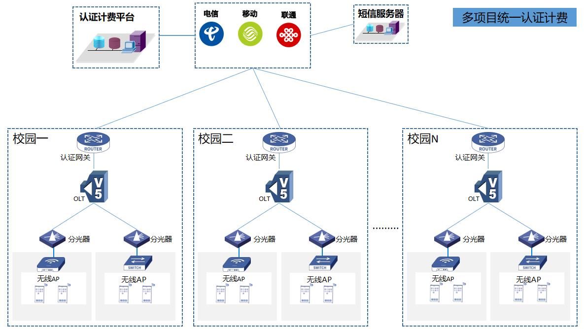 校园WIFI运营商与三大运营商合作,通过代拨的方式,使学生在校园内使用PORTAL认证,在运营商处采用拨号认证。