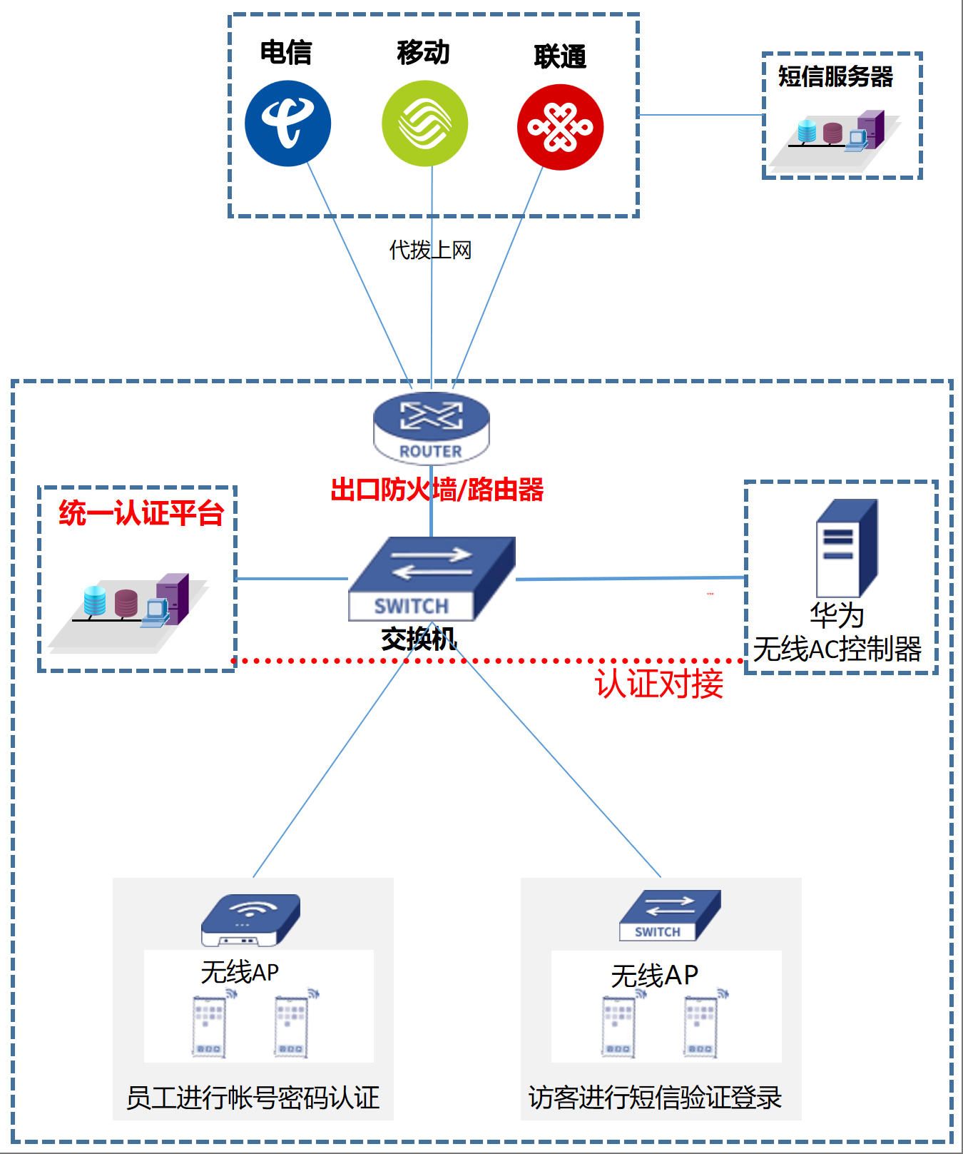 经过比较和选择,最终选择了蓝海卓越的AAA统一无线认证平台,对接华为的AC实现无线PORTAL认证,短信认证,员工及访客认证。