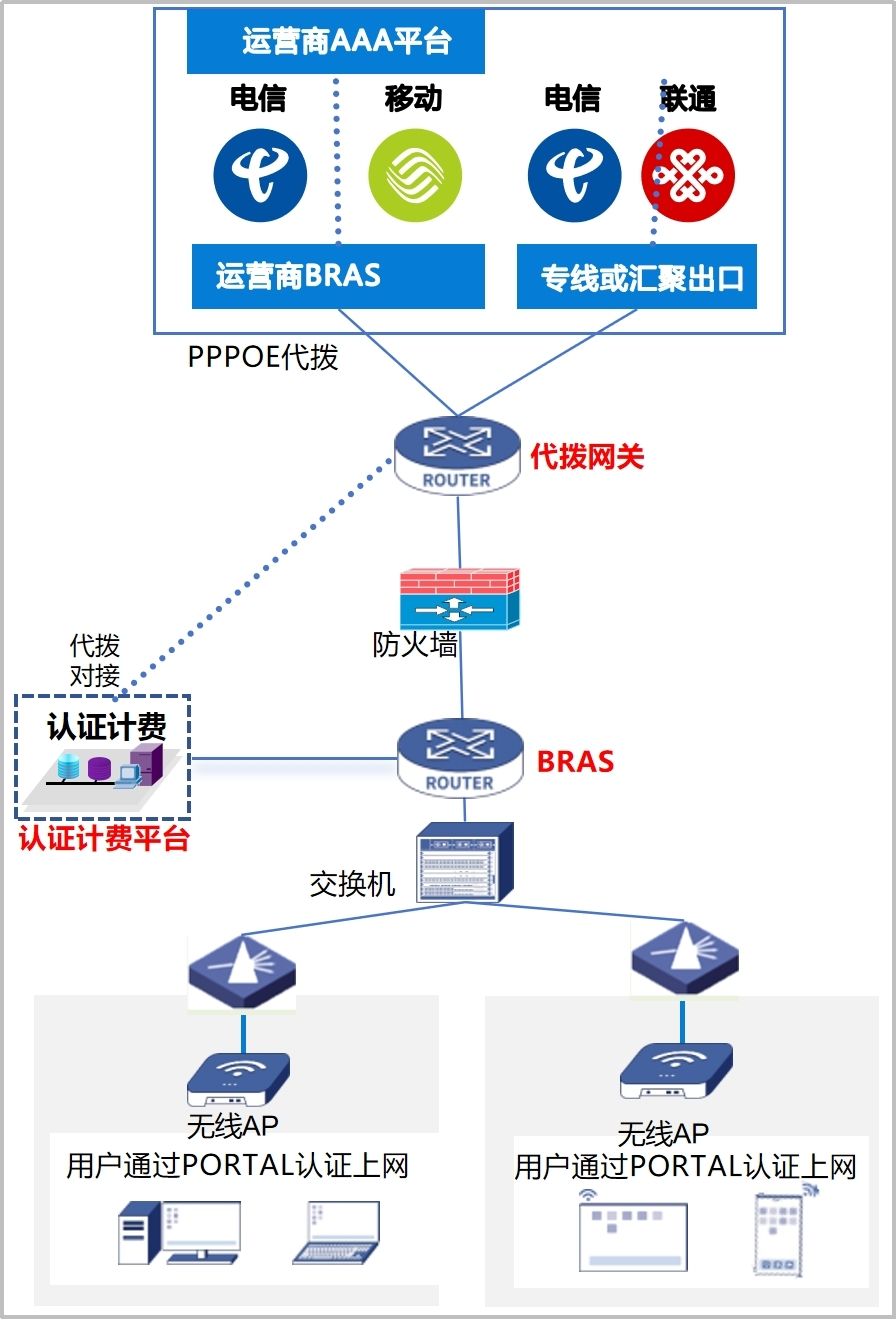 电信、联通、移动、三家运营商均采用BRAS直接接入代拨网关