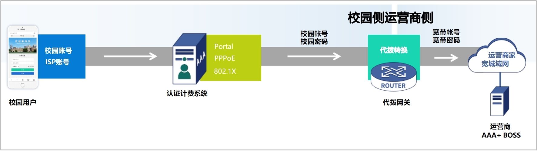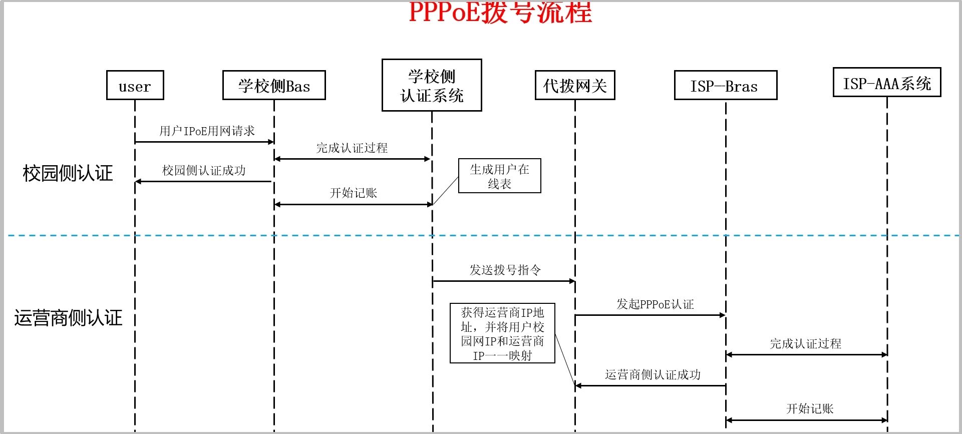 l 代拨网关发起PPPOE代拨:校内AAA将运营商账号发给代拨网关,然后由代拨网关发起PPPoE拨号。